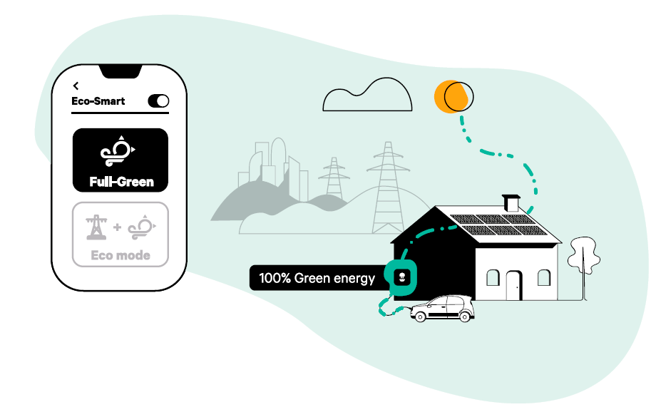Charge your car with solar or wind energy at home! When the panels produce enough electricity to charge the electric vehicle - the ‘Full-Green Mode’ automatically turns on. At this moment, the car will charge to 100% using the solar panel or wind generator energy. If the energy is not enough, the ‘Eco’ mode will automatically turn on, which will track the excess solar energy that is not used in your house and in real time it will mix it with the grid energy to ensure efficient charging, minimizing energy consumption.